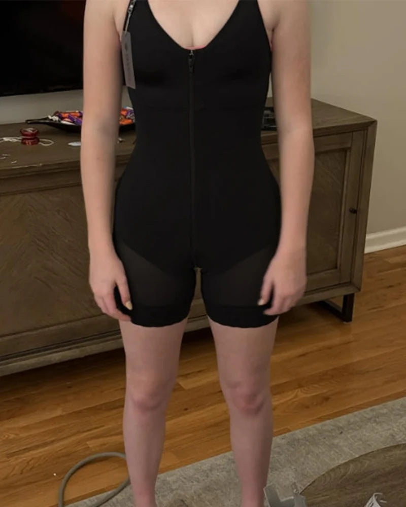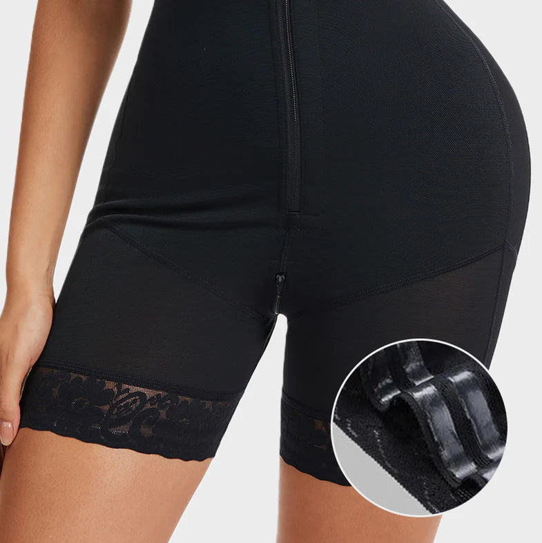 Des agrafes internes combinées à un zip externe pour un enfilage facile et un maintien optimal au niveau du ventre.
